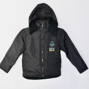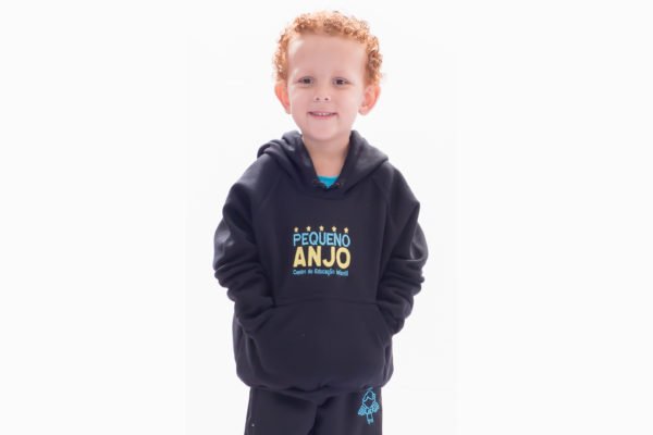 Blusa preta fechada confeccionada em moletom, com capuz.